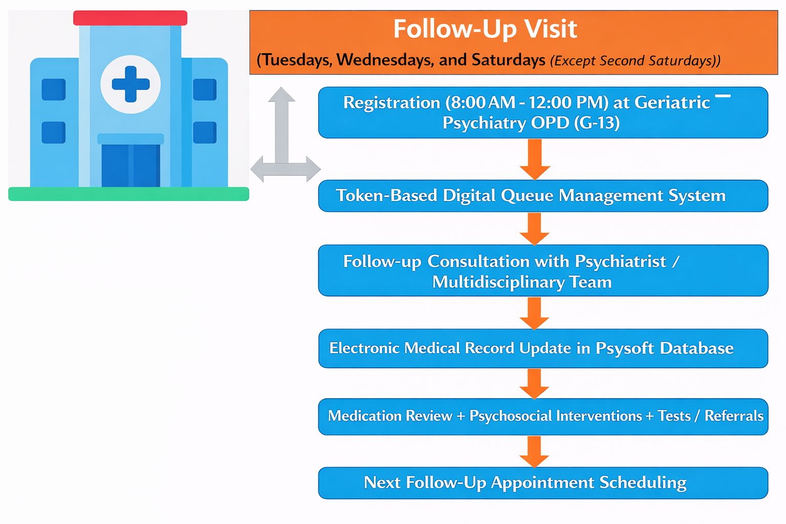 NIMHANS has a tele-medicine Centre which offers Tele-After Care Services. Any patient who has been evaluated in detail by our team if eligible will be offered TAC services. Under these services, patients will be followed up by their respective doctors by video conference and prescription is sent by email. To be eligible for this service, patient or family members must be from distant places with difficulty commuting to NIMHANS regularly, have a working internet connection, a smart phone or tablet or laptop and be able to follow directions given by our team to establish a connection when required. Patients with coexisting medical and neurological issues might have to be examined physically regularly and might not benefit from TAC services. Considering the current Covid- 19 situations, we have initiated telephonic and video consultation follow-up services for regur patients as well. Please ask about this to your doctor during the 1st or later visits to geriatric clinic.
